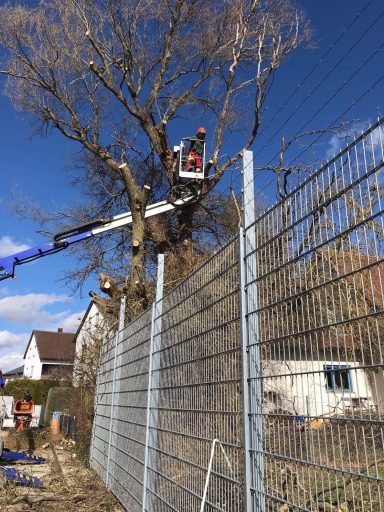 Wir legen die Fällrichtung fest, sichern das Gelände und schützen Gebäude, Zäune oder Wege.