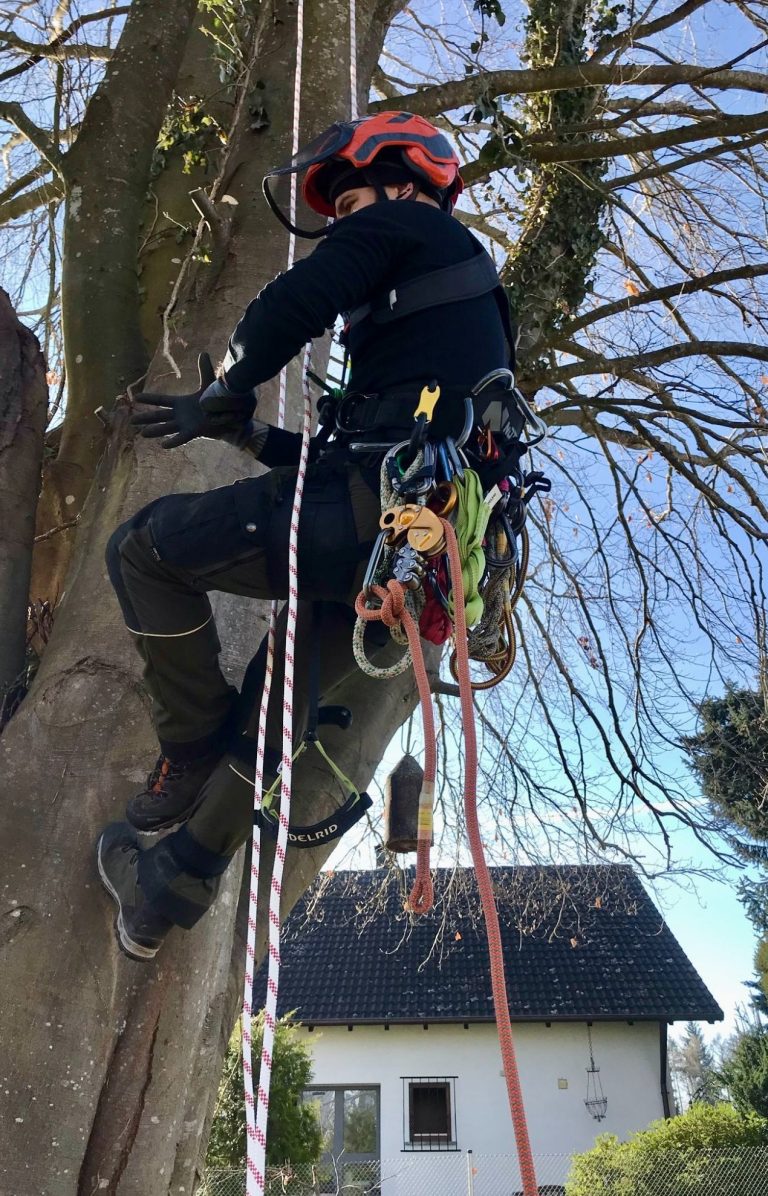 Steht er eng zwischen Gebäuden oder über Gehwegen, arbeite ich mit Seilklettertechnik: Der Baum wird von oben nach unten Stück für Stück abgetragen.